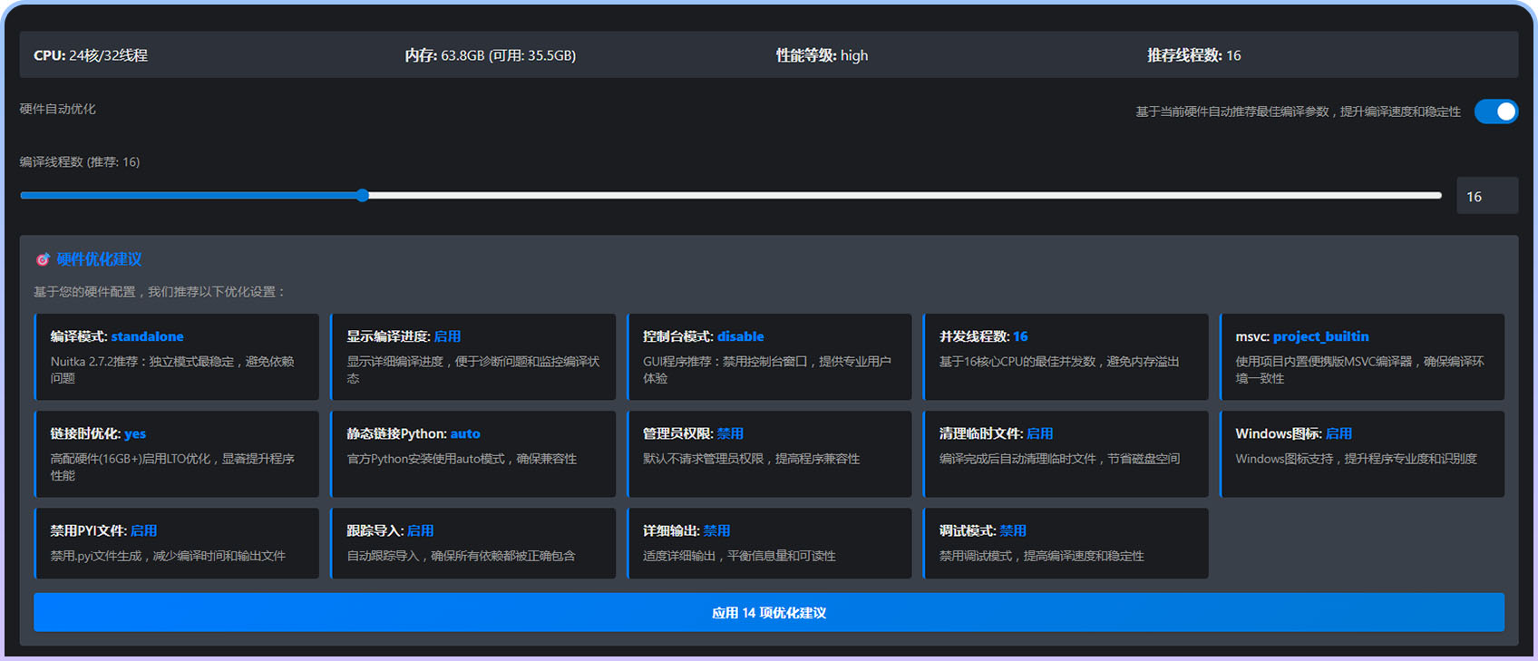 支持Nuitka全部参数,提供参数说明和智能推荐,满足各种复杂打包需求。