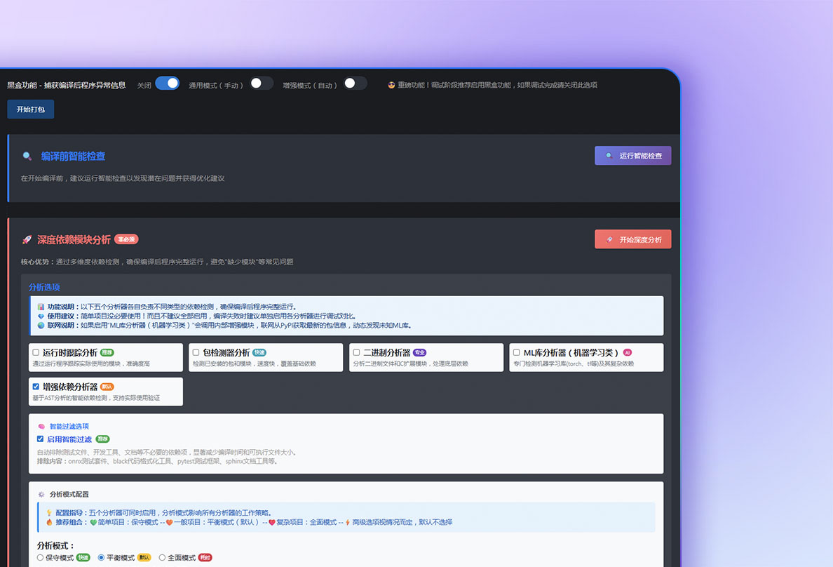 专业级Python打包工具,集成五大智能分析引擎,支持全部Nuitka参数,为您提供最佳的Python应用打包体验。